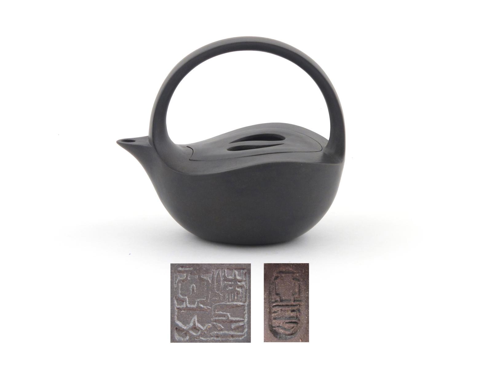 An unusual Yixing teapot and cover modern, by Ding Yaping, the rounded duanni body covered with a dark green wash beneath an overhead handle, impressed marks to the base, cover and handle, 13cm. (2)