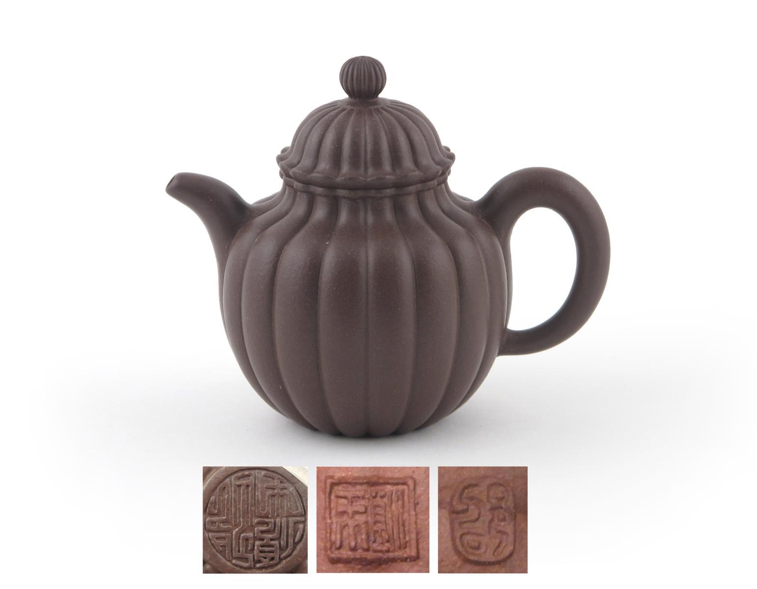 An Yixing chrysanthemum teapot and cover modern, by Shao Shunsheng, the dark body evenly fluted, circular mark to the base, the cover with two further impressed marks, 15cm. (2)