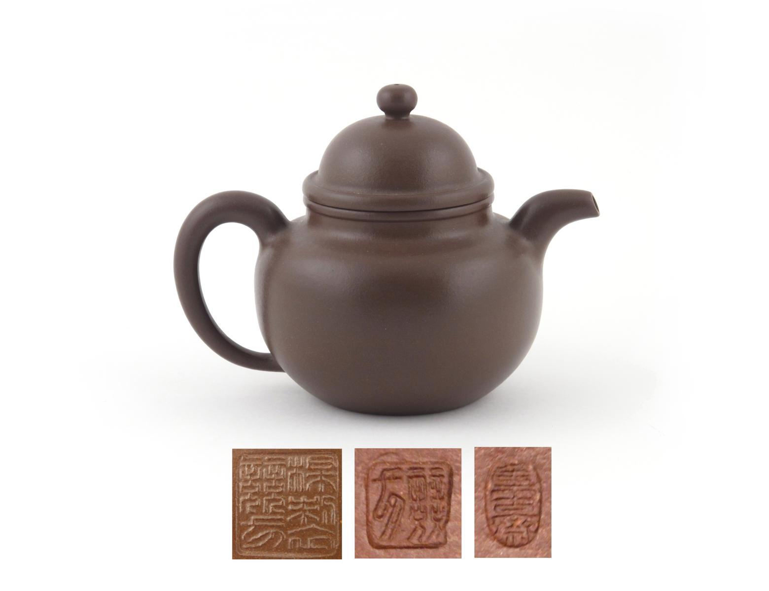 An Yixing Ming-style teapot modern, by Yang Qinfang, the traditional shape a rich muddy brown with a textured finish, impressed seal mark to the base, further marks to the cover and handle, 18cm. (2)