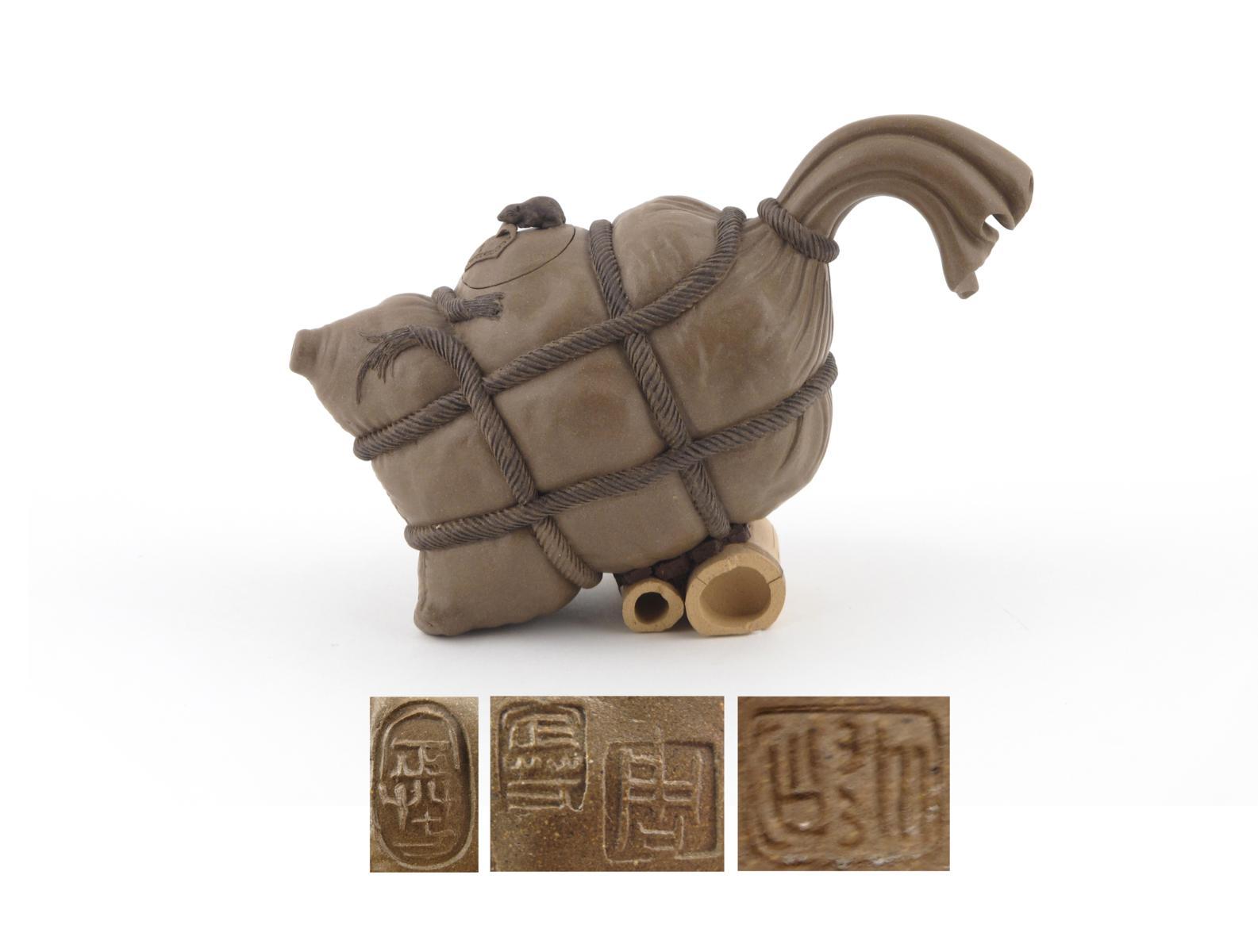 An Yixing teapot and cover modern, modelled by Zhou Dingfang in the shape of a treasure sack, knotted with rope and resting on bamboo stems, the cover surmounted with a ship's rat nibbling on the hem of the treasure map, impressed marks beneath the handle and to the inside of the cover, 19cm. Together with a framed certificate. (3)