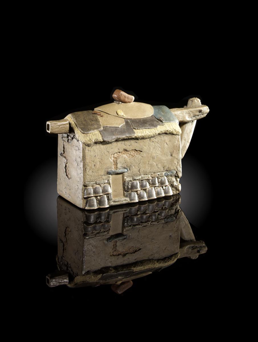 A sculptural Yixing teapot and cover modern, by Zhou Dingfang, 'Scenery of Dingsu' modelled as a kiln with patched thatched roof and saggers around the sides, impressed mark to the base, 17cm. (2)
