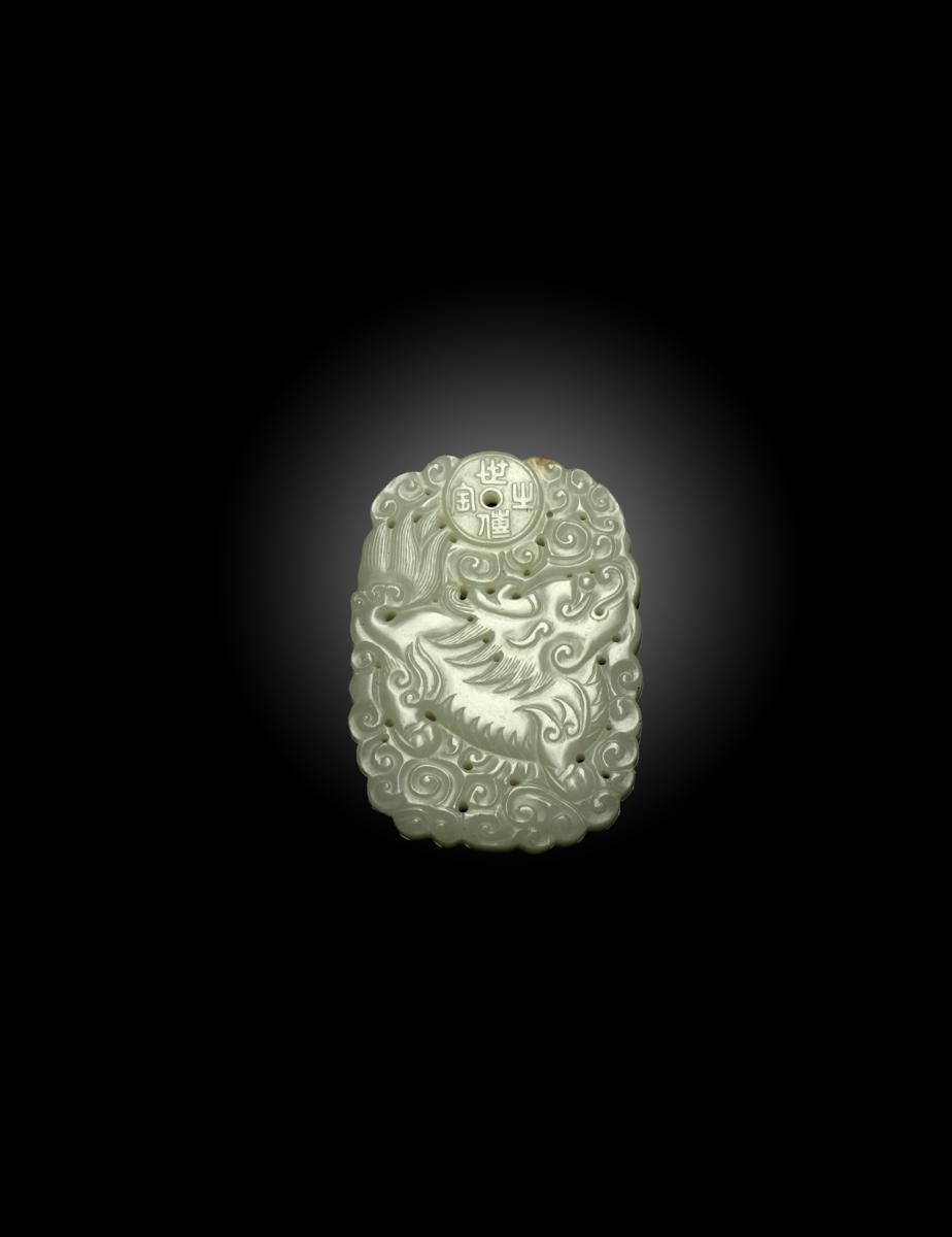 A Chinese pale celadon jade pendant 19th century, crisply carved and reticulated with a mythical beast to each side beneath a cash symbol, carved with four character marks, 5.4cm.