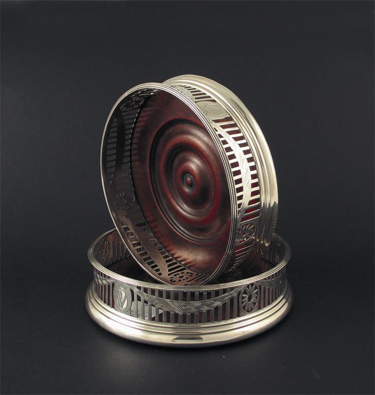 A pair of George III wine coasters, with turned wooden bases and pierced sides engraved with drapery festoons by John Emes, London1801, 5.3in (13.5cm)diameter (2)