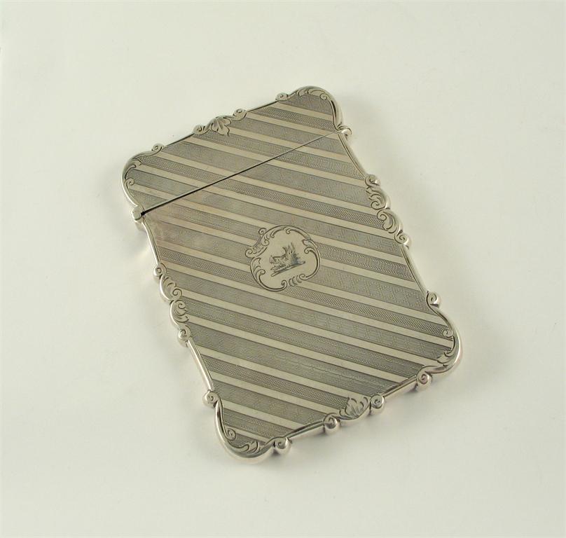 A Victorian engine turned card case, decorated with diagonal strips, and a central cartouch, crested, by Nathaniel Mills, Birmingham, 1845, 4in (10cm), 2oz.