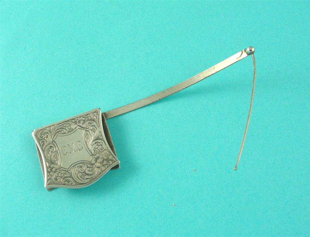 A late Victorian 'cross patent' book mark, with an engraved panel, initialled 'CMC' by W. Cross, London 1897, 4in (10cm)long.
