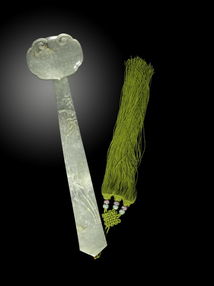 A good and large Chinese celadon jade ruyi sceptre four character Qianlong seal mark but 19th/20th century, the curved stem carved with tall stems of bamboo upon which two small long-tailed birds perch, the bamboo curving around five columns of calligraphy, the head and reverse of the stem with further calligraphic inscriptions, in a fitted box, 47cm.