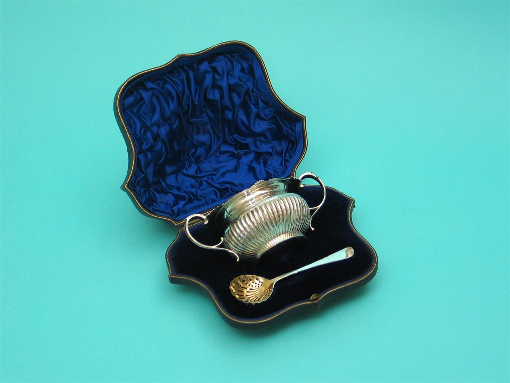 An Edwardian sugar bowl, with half fluted bowl, scroll handles, and matching sifter spoon with fluted gilt bowl, contained in a case with blue silk lining, by William Hutton & Son, Sheffield/London, 1901.