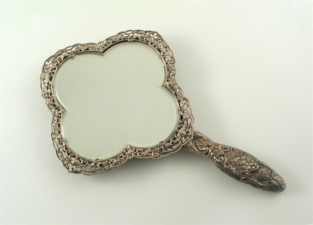 A late Victorian hand mirror, with quatrefoil glass and pierced border, embossed handle and scene on the reverse of a dancing couple, vacant cartouch, in case with silk lining, by Samuel Jacob, London, 1899.