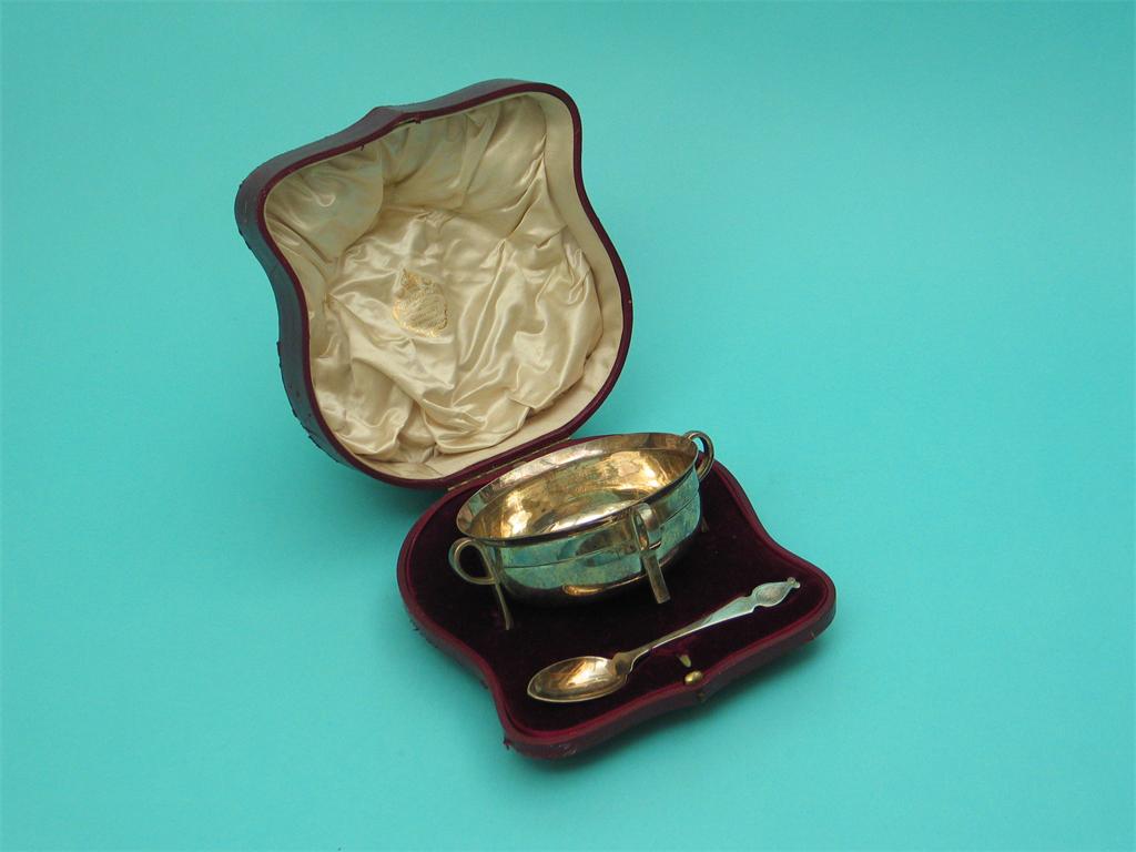 An Edwardian Christening bowl, on four feet and matching spoon with lyre shaped terminal, monogrammed to match, in case with cream silk lining, by Alexander Clark Manufacturing Co., Birmingham/Sheffield, 1905.