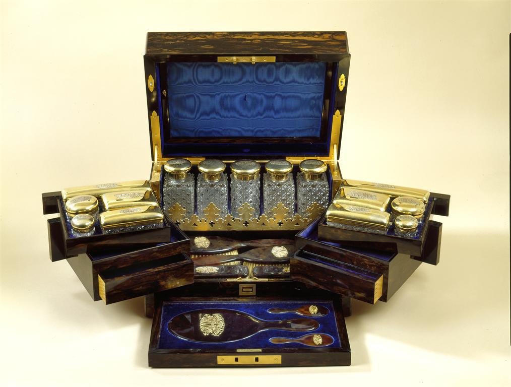 A Victorian large brass bound Maccassa ebony toilet box, with a lift up cover and a fall front revealing two sets of swing-out trays (the lower trays with concealed drawers), fitted with the following cut glass silvergilt mounted items: four toilet water bottles, a cylindrical jar, four small circular pots, two narrow oblong boxes, three other boxes and an oblong powder box with sprung cover; the interior with a tortoiseshell dressing table set comprising: two hair brushes, two clothes brushes, a pair of glove stretchers, a shoe horn, a hand mirror and two dental mirrors; the tortoiseshell items with a large applied gold cypher, the cover similarly applied with a silvergilt cypher and the mounts engraved with the same, the mounts by Messers Betjemann, Betjemann and Betjemann, London, 1881-1885, the fall front with an inset gilt metal plaque inscribed 'R and S Garrard & Co., 25 Haymarket, and 29 to 32 Panton Street', the box measuring 9.75in (24.6cm) x 14.5in (37cm) x 11.6in (29.5cm).