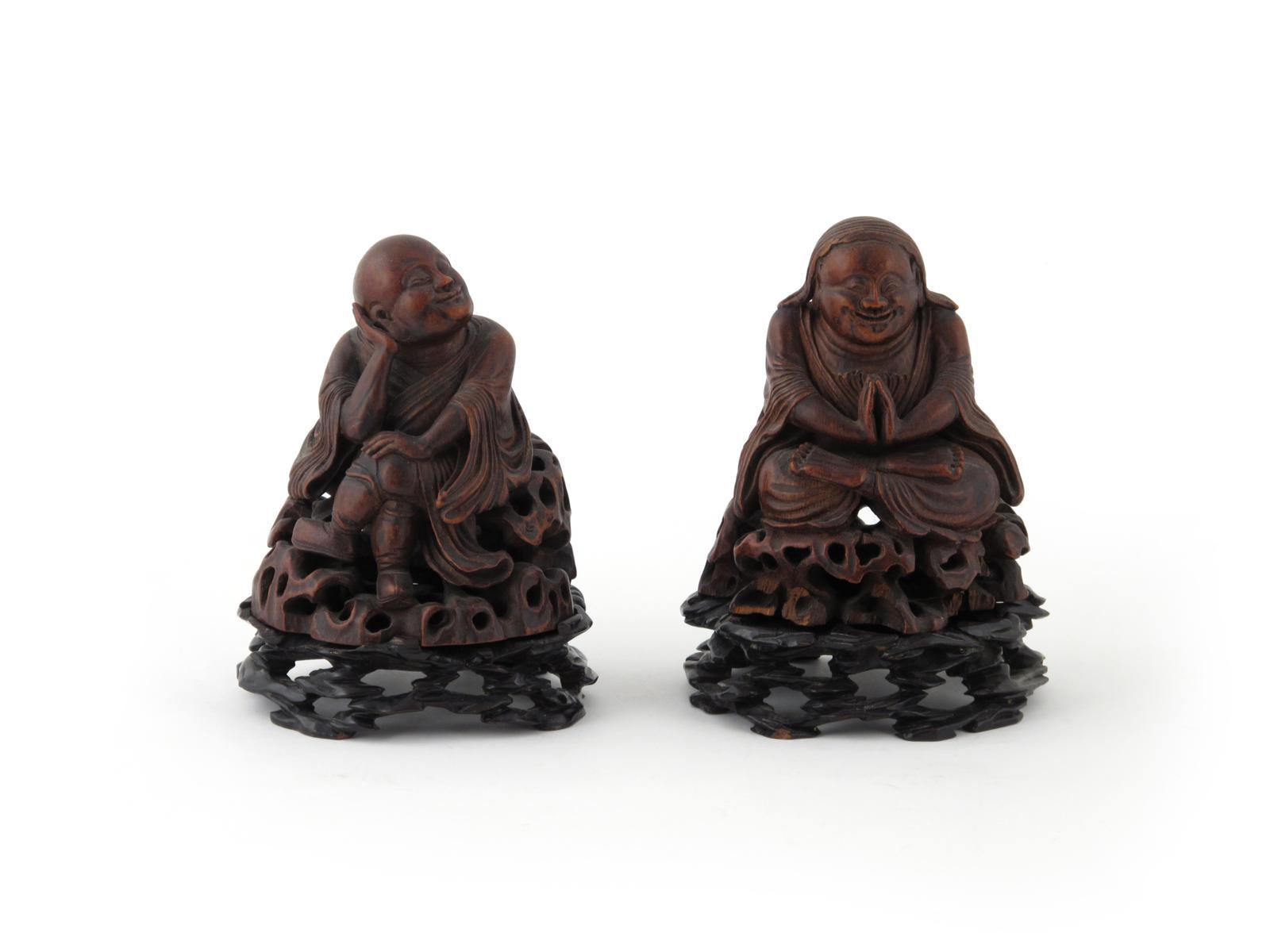 A pair of Chinese bamboo carvings of figures 18th/19th century, both seated on pierced rockwork, one praying, the other listening to a distant sound, each on hardwood stands, old repairs and losses, 18cm overall. (4)