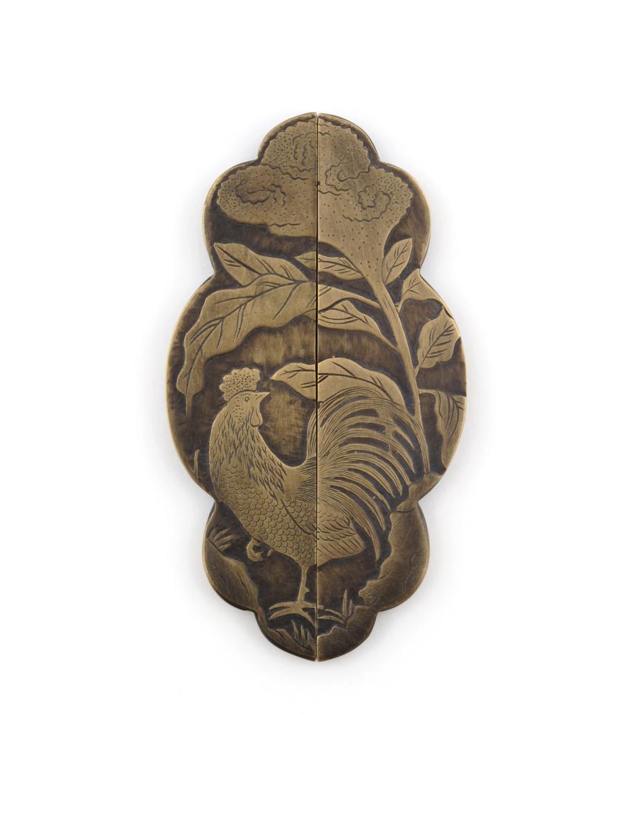 A pair of Japanese bronze scroll weights Meiji 1868-1912, cast as two halves of a shaped plaque with a cockerel beneath a large flower, each with a two character mark for Hidefumi, 12.2cm. (2)