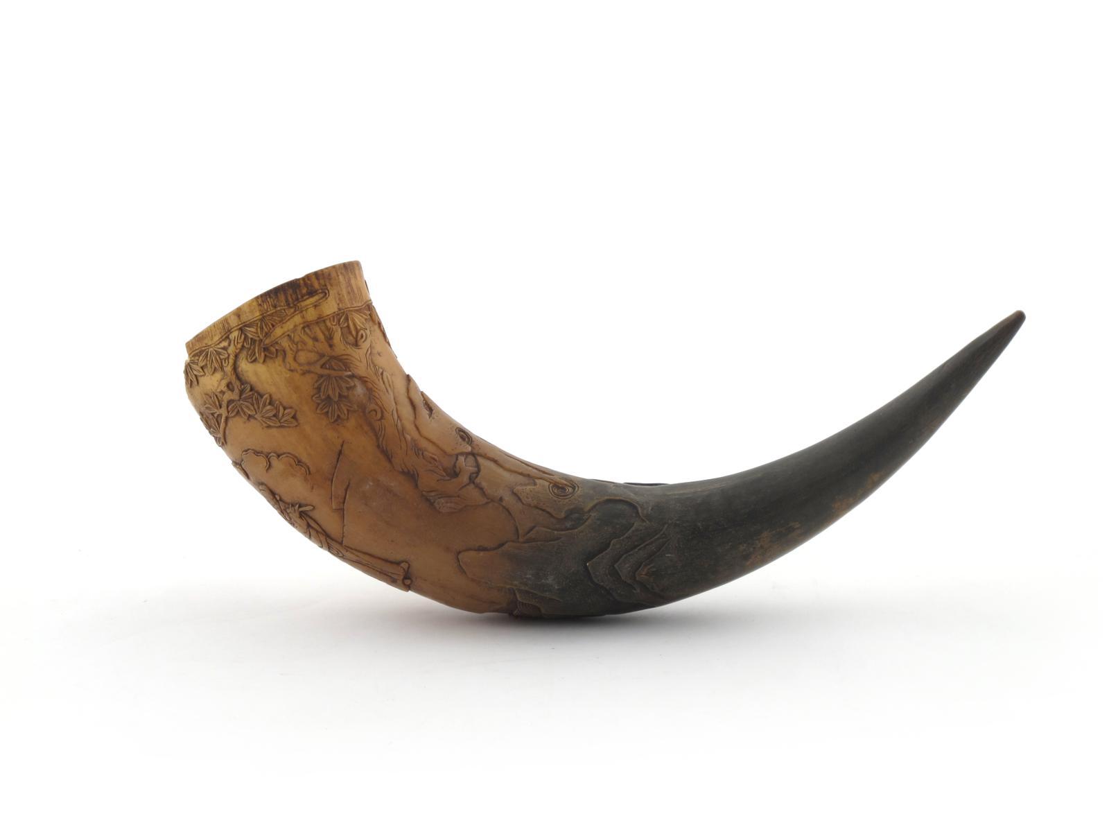 A Chinese carved horn 19th/20th century, carved in relief with a figure beneath pine trees amongst rockwork, and with four line of calligraphy, damages, 39cm. Provenance: formerly the property of Captain Raymond Jones.