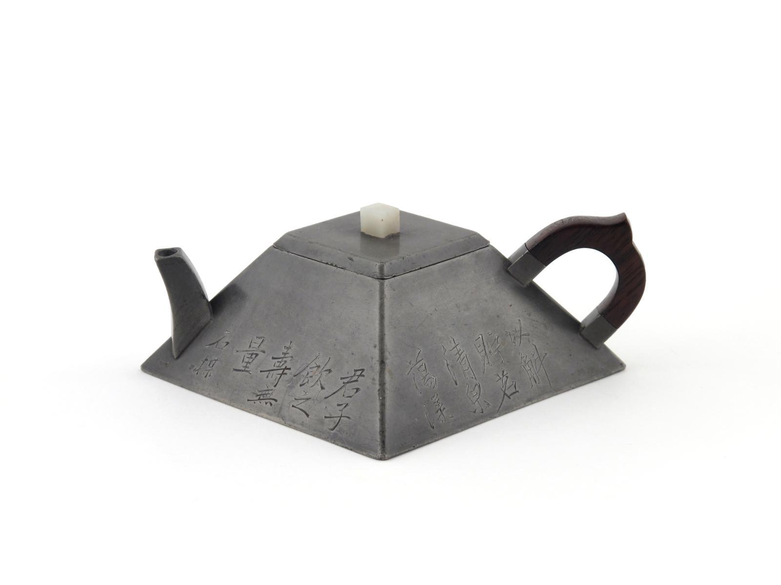 A Chinese pewter square section teapot and cover early 19th century, attributed to the scholar Zhu Jian, decorated with calligraphy, the knop formed from white jade, 16.8cm. (2)