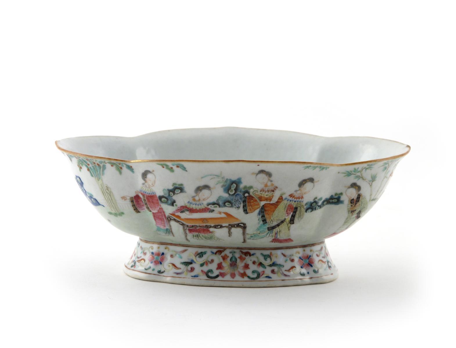 A Chinese famille rose quatre-lobed bowl iron red four character Daoguang mark and of the period 1821-50, the exterior painted with twelve young ladies at leisure in a garden, the interior and flared foot with flowers, 26.5cm.