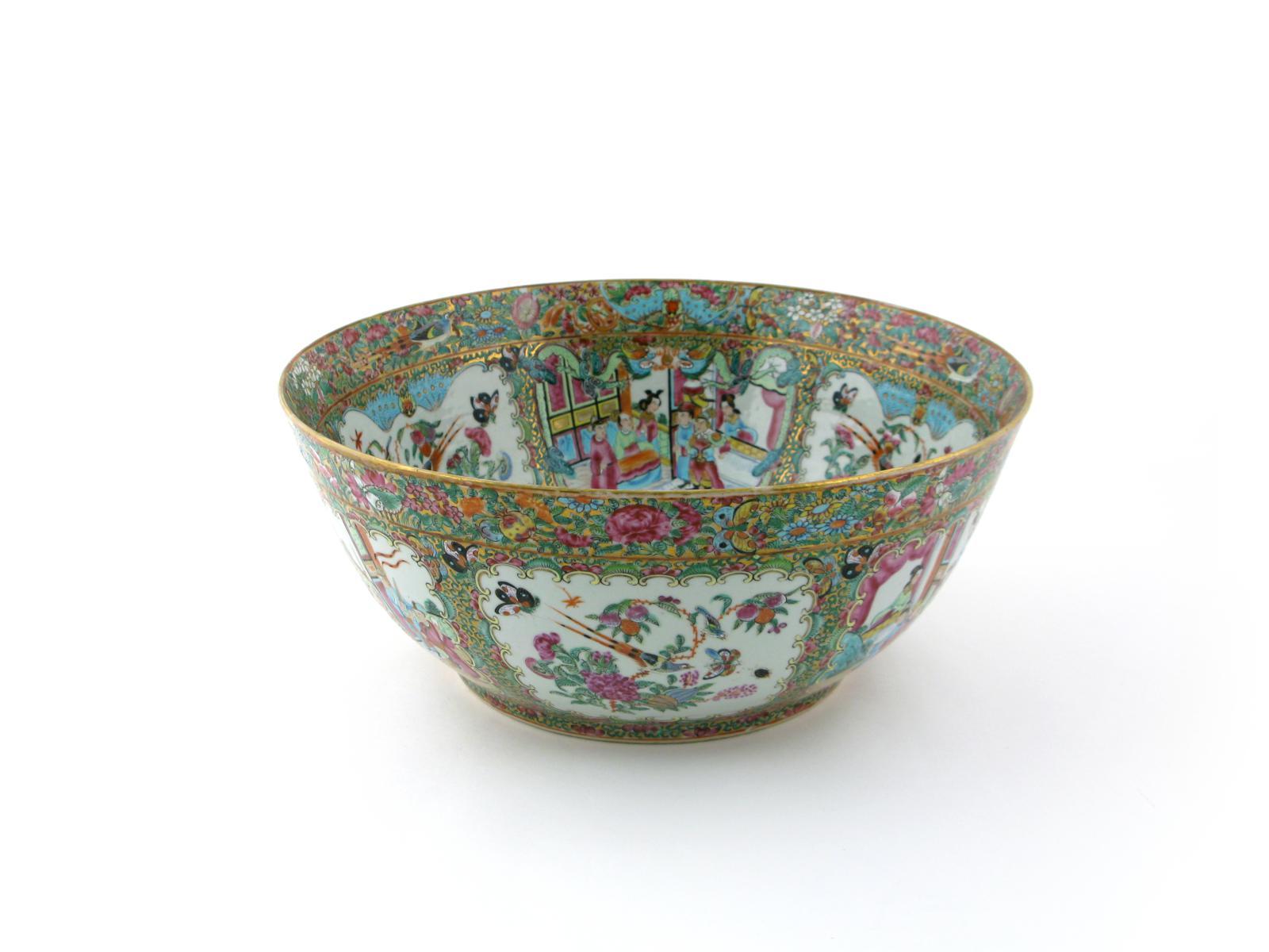 A large Chinese Canton famille rose bowl 19th century, brightly enamelled with panels of figures, divided by panels of birds, butterflies, fruit and flowers, the borders with birds, bats, flowers and foliage on a gold ground, 40.6cm.