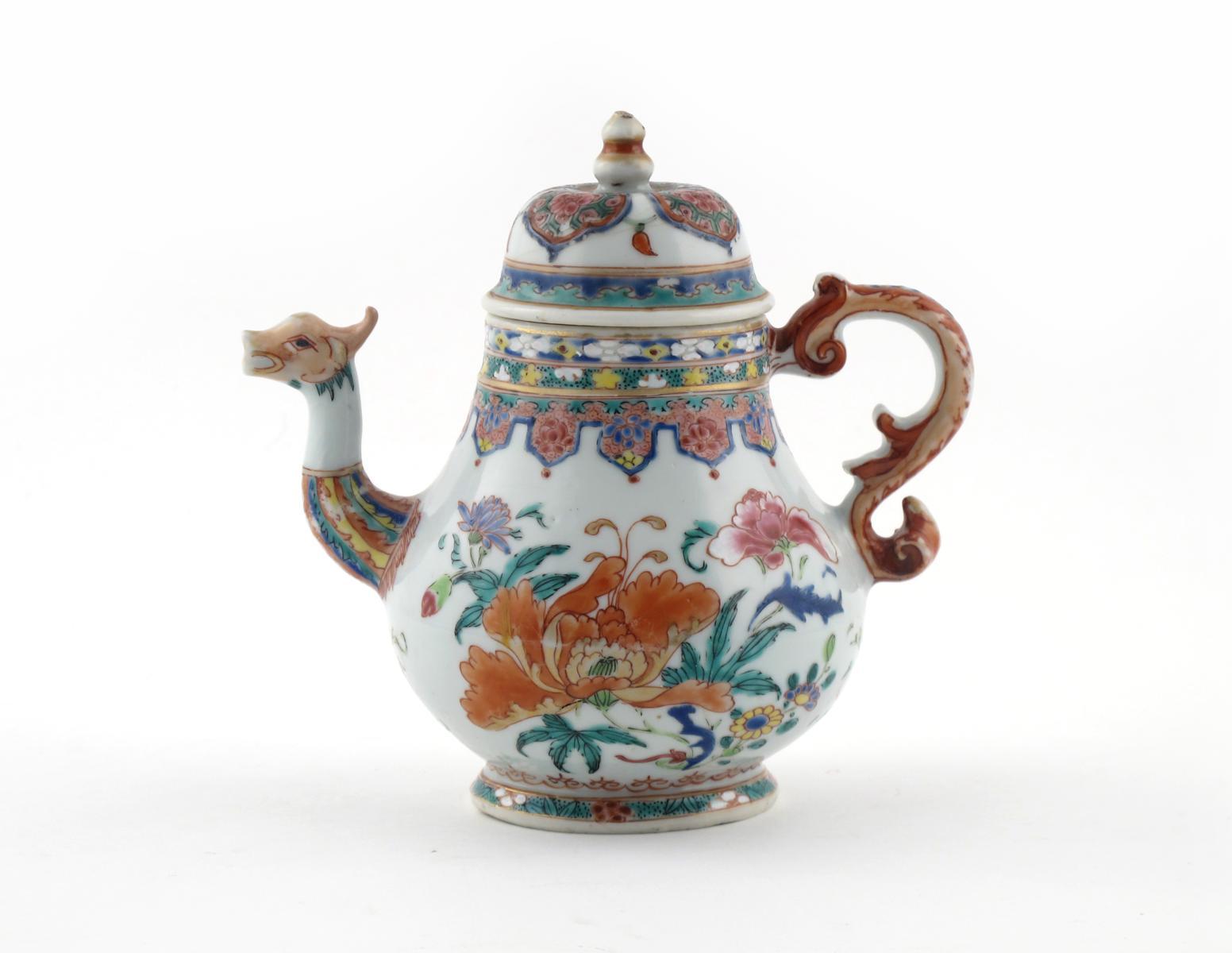 A Chinese famille rose teapot and cover c.1740, the spout in the form of a dragon's head, the handle is the beast's tail, the body painted with peony blooms and foliage, some good restoration, 17cm. (2)