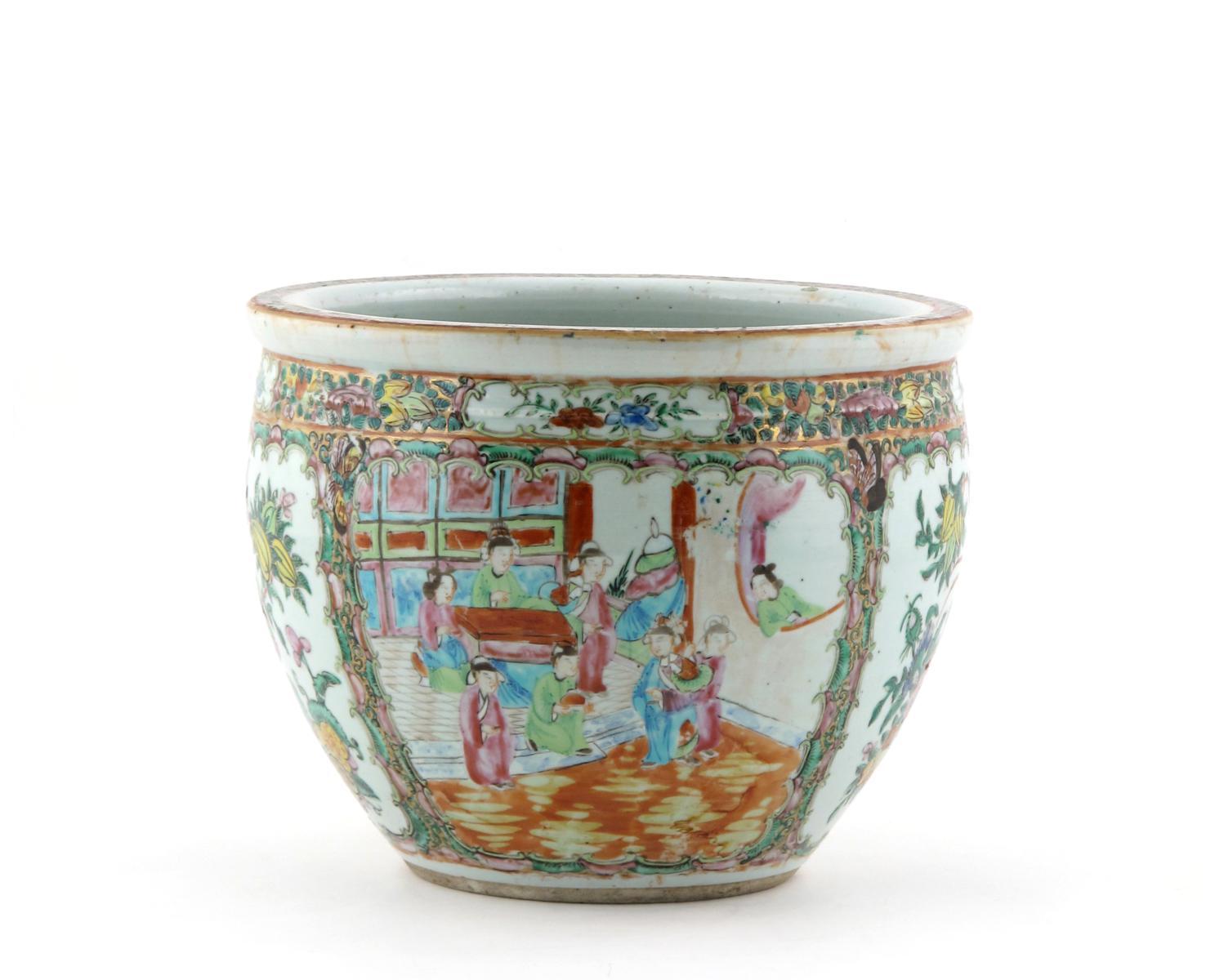 A Chinese Canton famille rose jardinière c.1880, typically painted with panels of birds, flowers, figures and fruit, 32cm.
