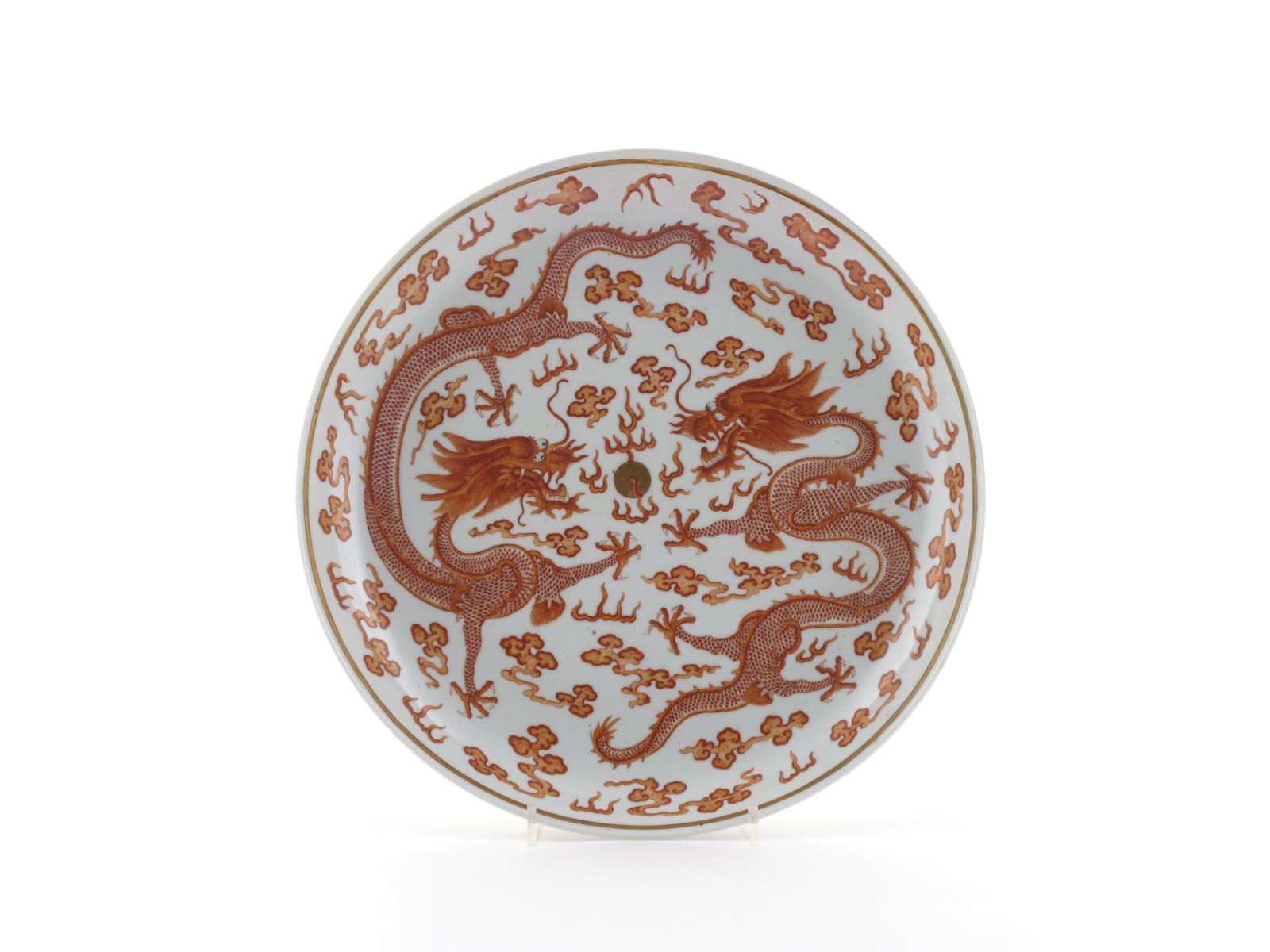 A Chinese iron red and gilt decorated dragon dish six character Guangxu mark and probably of the...