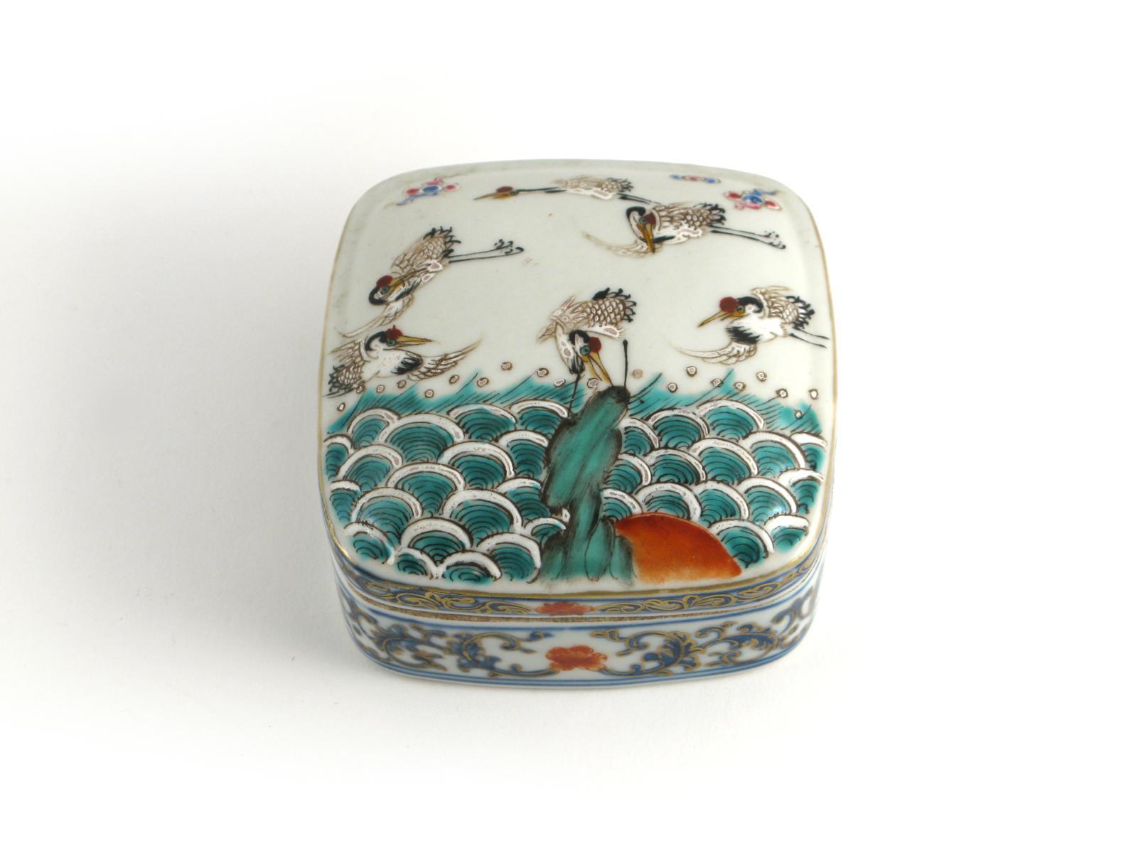 *A Chinese square section box and cover Daoguang seal mark but later, painted with six cranes flying above the sea, the sides with leaf scrolls in blue and gold, 8cm. (2)