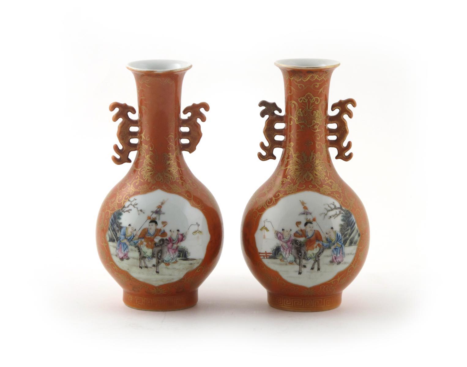 A pair of Chinese coral ground and gilt decorated vases early 20th century, finely painted with figures and kylin, the necks with stylized bat handles, both with iron red marks ju ren tang zhi (hall where benevolence resides), damages to the handles, 22cm. (2)