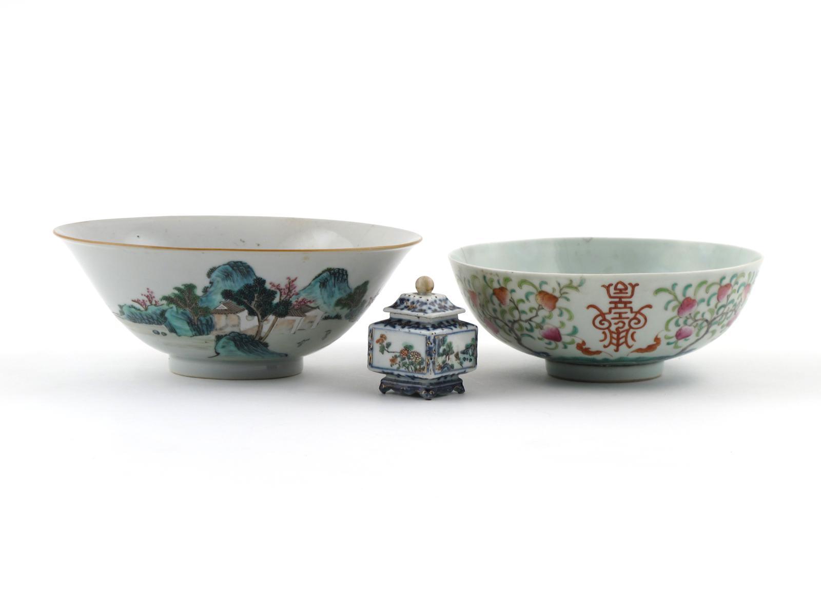 Two Chinese famille rose bowls one with a Qianlong seal mark but later, decorated with figures in a mountainous garden scene, the other with bats and peach trees above a wave border, and a miniature square-section vase and cover with a four character Qianlong seal mark, painted with flowers and landscapes with blue and gilt scrolling borders, some faults, 20.5cm max. (4)