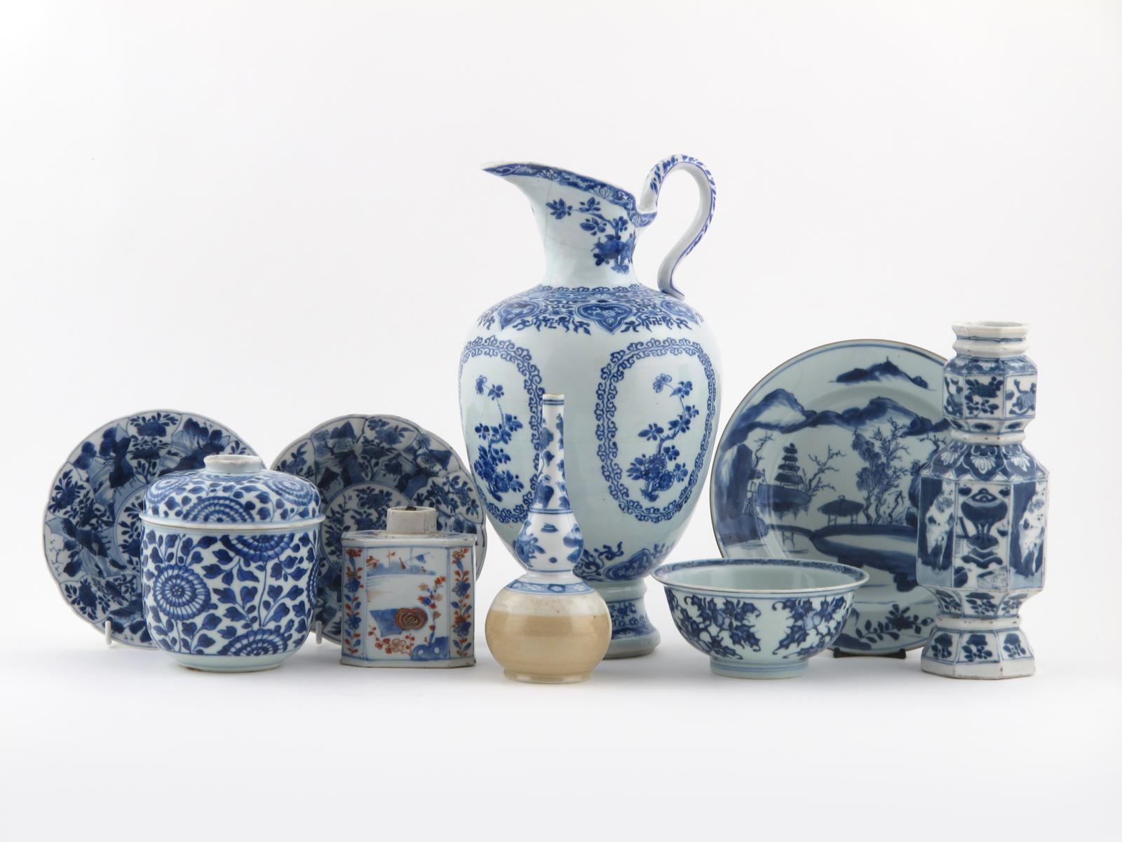 A small collection of Chinese blue and white porcelain 18th century, comprising: a ewer, a plate, a vase, three bowls and a jar and cover, together with a Chinese Imari tea canister and a rose water sprinkler, all with damages, 33.5cm. (10)