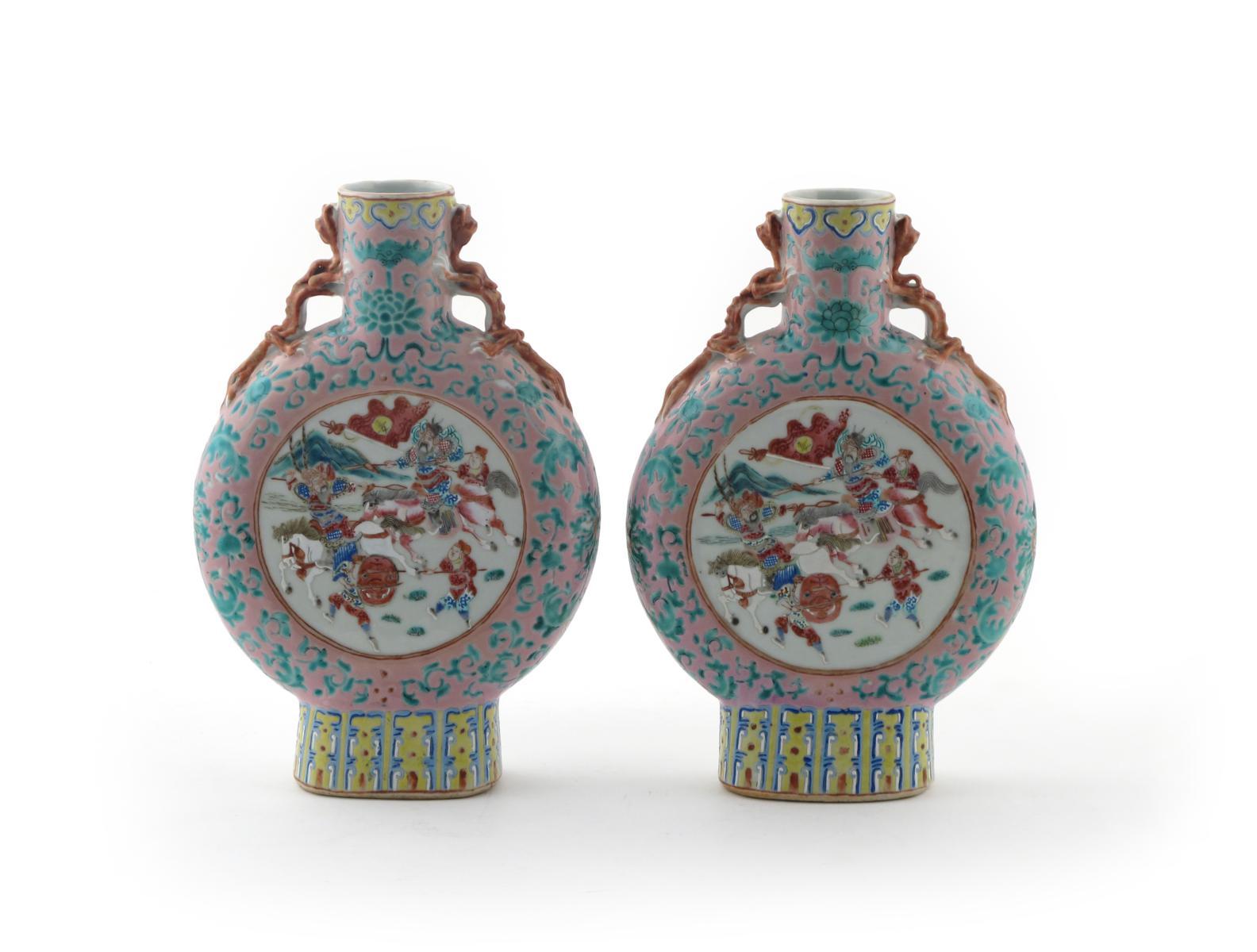 A pair of Chinese famille rose moon flasks c.1880, painted with equestrian warriors and phoenix between rocks and flowers, 26.7cm. (2)