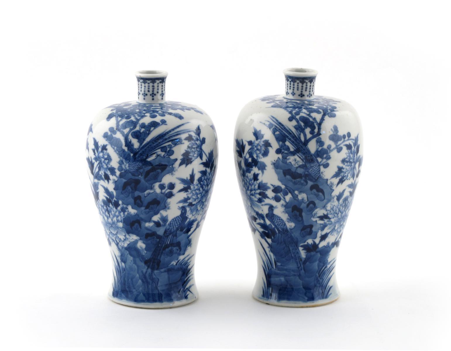 A pair of Chinese blue and white meiping vases 19th century, painted with pheasants on rockwork amidst peony and prunus, each with a six character Kangxi mark, 22.5cm. (2)