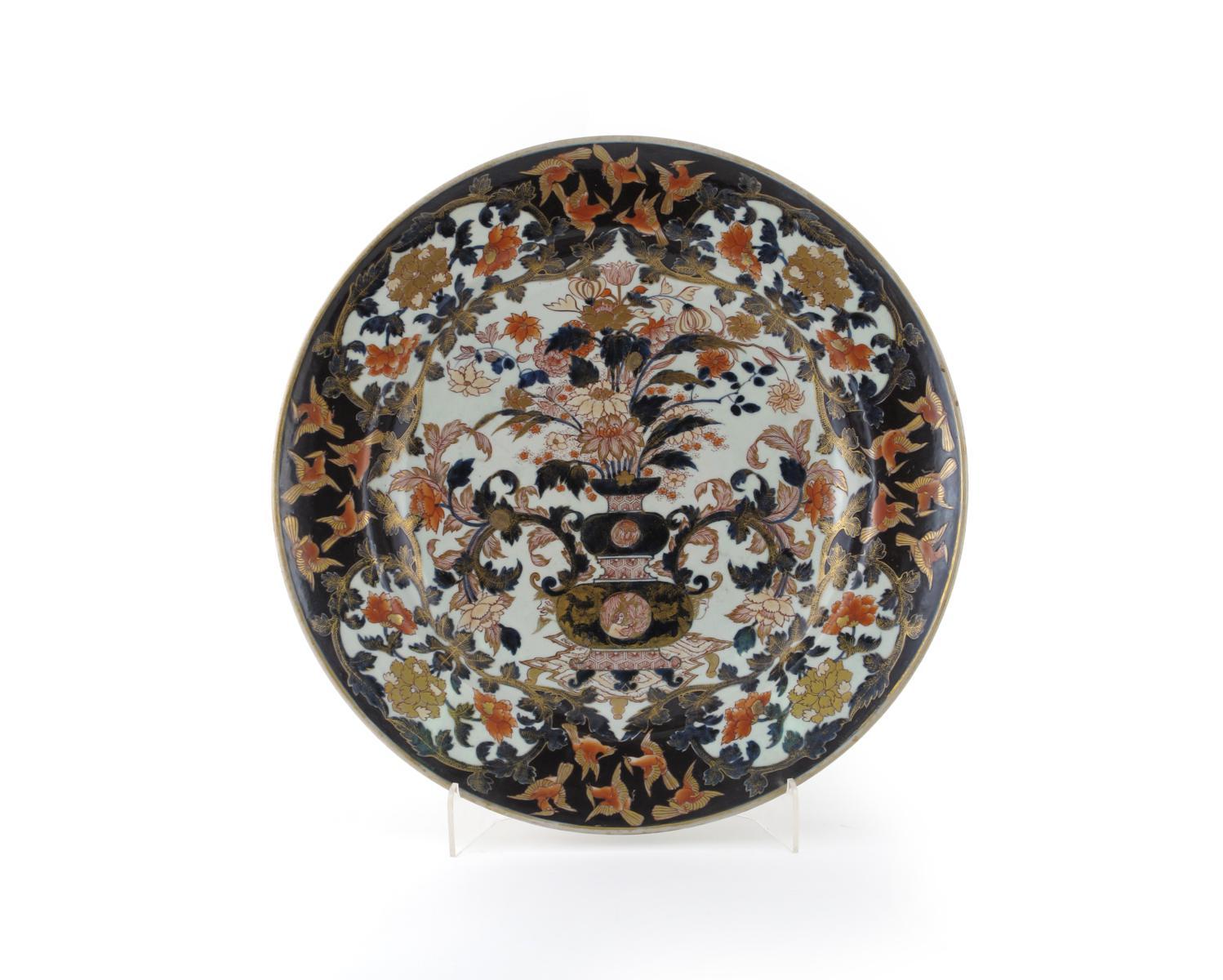 A large Japanese Imari dish c.1700, painted with a central vase, flowers and foliage, the border with panels of birds in flight, a flower mark to the base, 59cm.