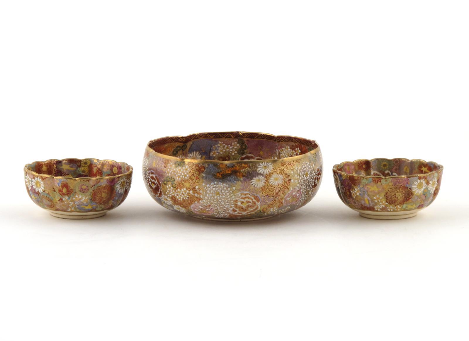 Three Japanese Satsuma bowls 20th century, decorated with brightly coloured flower blooms and gilt details, each with seal marks, 15.5cm. (3)