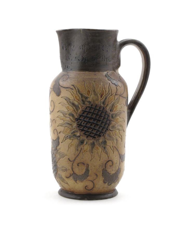 A Martin Brothers stoneware jug, cylindrical form with collar neck, incised with a large Aesthetic Movement sunflower, in shades of ochre and brown on a buff ground, the neck incised with a poem inscription incised 25.3.51 (81) Martin London & Southall, minor professional restoration to top rim, 24cm. high