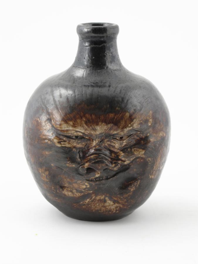 An unusual Martin Brothers face vase, modelled to both sides with a smiling face, glazed brown and ochre incised 7-1889 Martin Bros London & Southall, firing crack to base 24cm. high