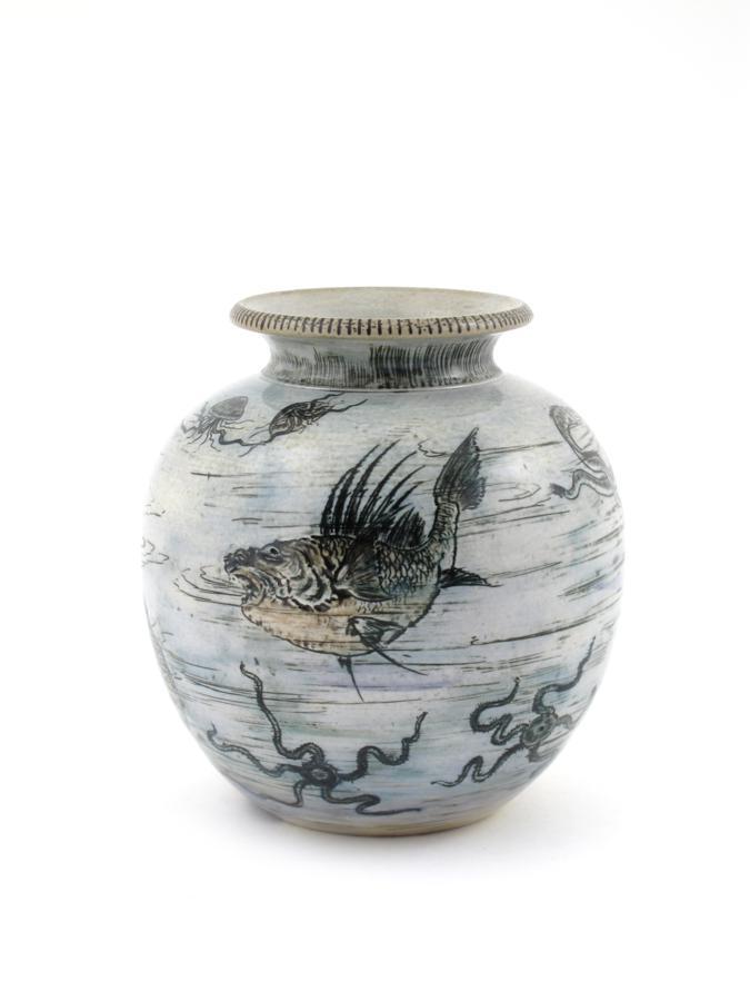 A Martin Brothers stoneware Aquatic vase, ovoid with everted rim, incised and painted with grotesque fish, eels, star fish and squid, in shades of green and ochre on a pale blue ground incised 9-1896 Martin Bros London & Southall, professionally restored base rim 17cm. high
