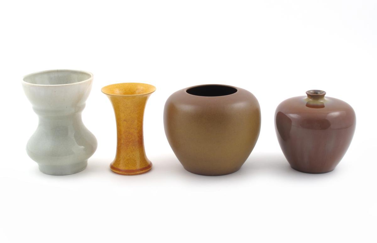 A Pilkington's Lancastrian vase, ovoid with everted narrow neck, covered in a finely streaked brown glaze, the neck golden, a shouldered vase by Robert Tunnicliffe covered in a matt brown glaze, another waisted vase and a orange streaked vase printed bee mark, impressed P 13cm. high