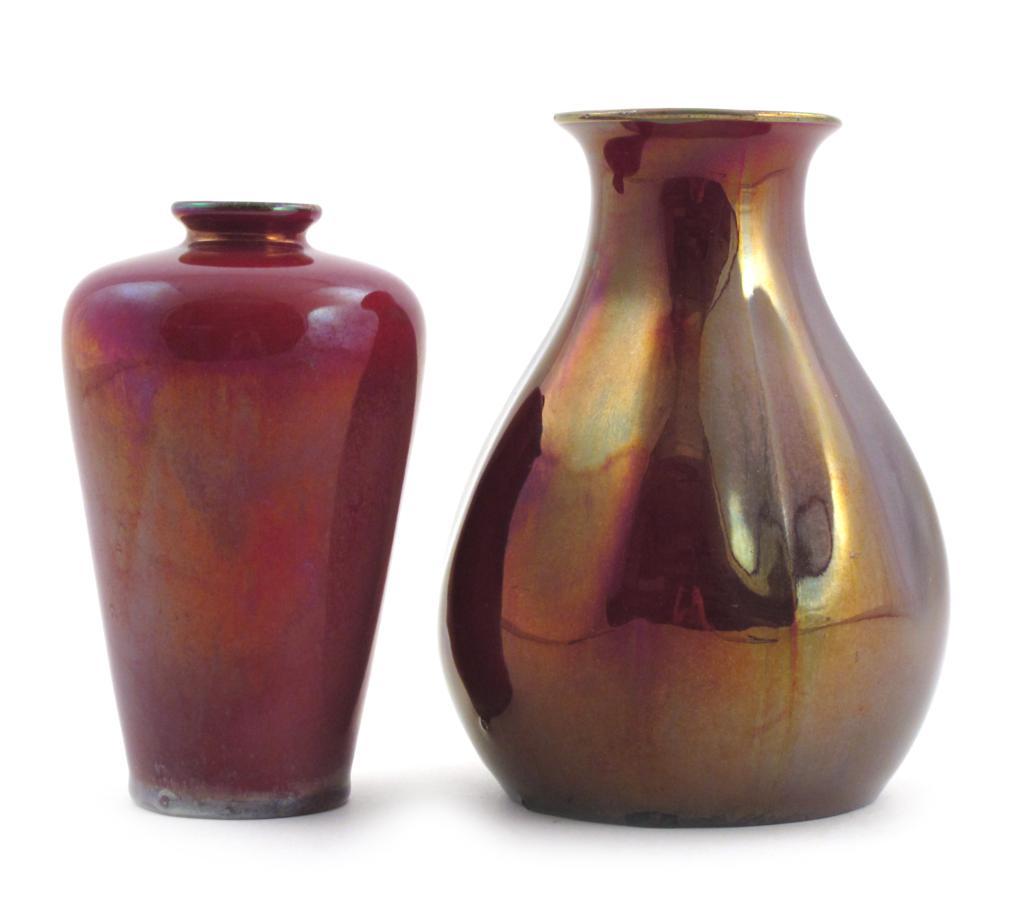 A Pilkington's Lancastrian red flambe lustre vase, ovoid, fluted body with everted rim, glazed to the interior with a golden lustre, and another flambe vase shape no. 338 impressed marks 16cm. high Provenance The Bill Coles Collection