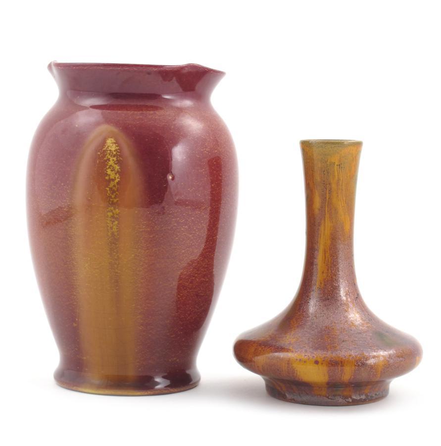 A Pilkington's Lancastrian vase, compressed form with tall cylindrical neck, covered in a rust and orange aventurine glaze, and an early vase, datemark for 1904 with everted fluted rim covered in a running brown streaked glaze impressed and printed marks 14.5cm. high