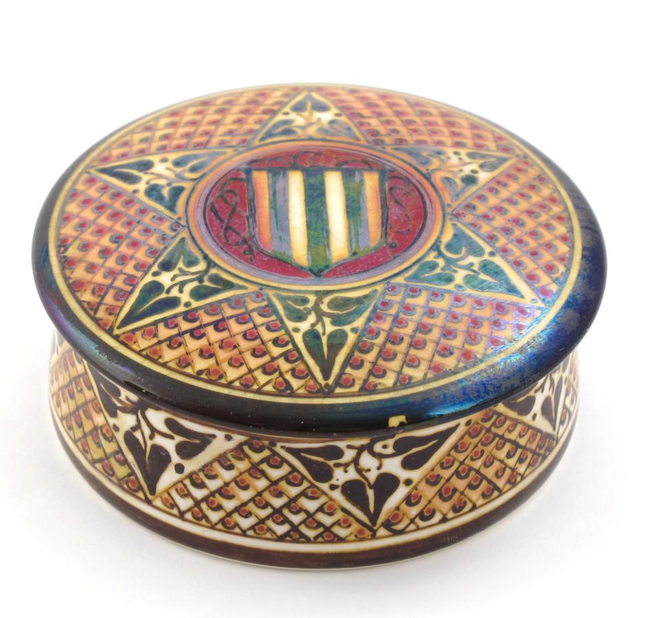 A small Pilkington Lancastrian box and cover by Gwladys Rodgers, dated 1907, circular form, painted to the cover with a heraldic shield, inside a border of foliage sprigs, in shades of ruby and gold lustre on a cream/yellow ground impressed marks and date mark, painted artist cypher, base restored 8cm. diam.