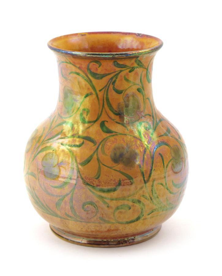A Pilkington's Lancastrian vase by Gordon Forsyth, dated 1912, painted with pomegranate fruit sprays in green on a golden-yellow lustre ground impressed marks, painted artist cypher and dated 9th Jan 1912, 19.5cm. high