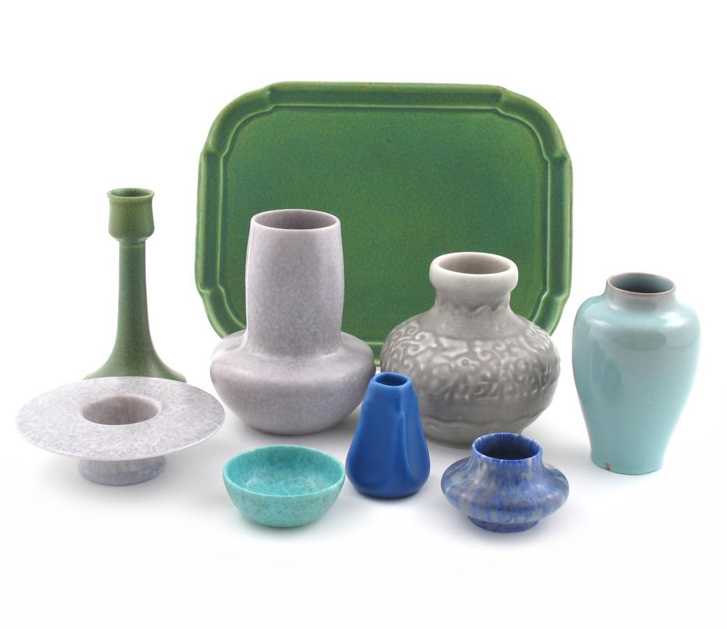 A Pilkington's Royal Lancastrian vase, by Richard Joyce, ovoid form modelled in low relief with a foliate design glazed matt grey, a matt green tray and candlestick four vases and two posy bowls various marks 13cm. high