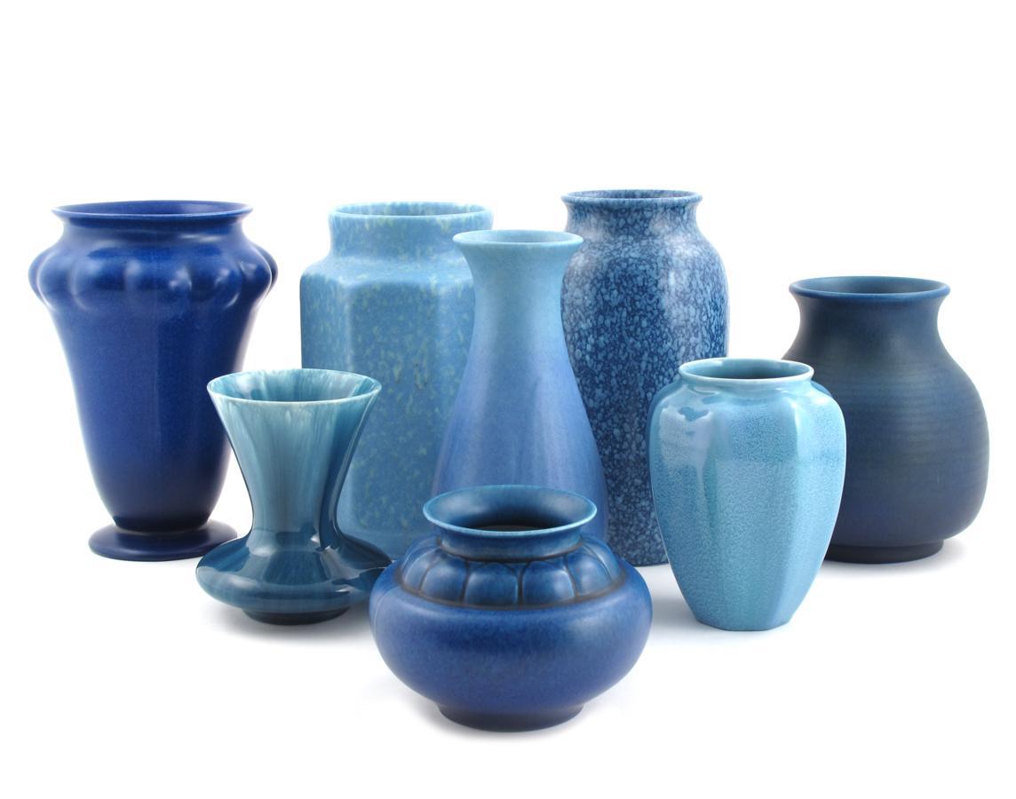 A tall Pilkington's Royal Lancastrian vase, shape no 2822, covered in a matt blue glaze, and seven other Pilkington's vases covered in various blue glazes various marks 24.5cm. high Provenance The Bill Coles Collection