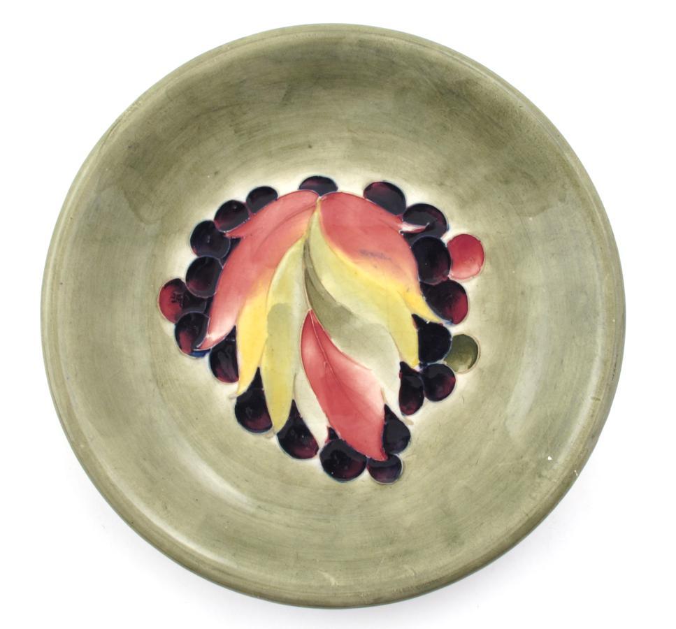 'Leaf and Berry' a Moorcroft Pottery plate, painted in colours on a green ground impressed mark, painted green signature, hairline to rim, 22cm. diam. Provenance The Collection of Ken Manley