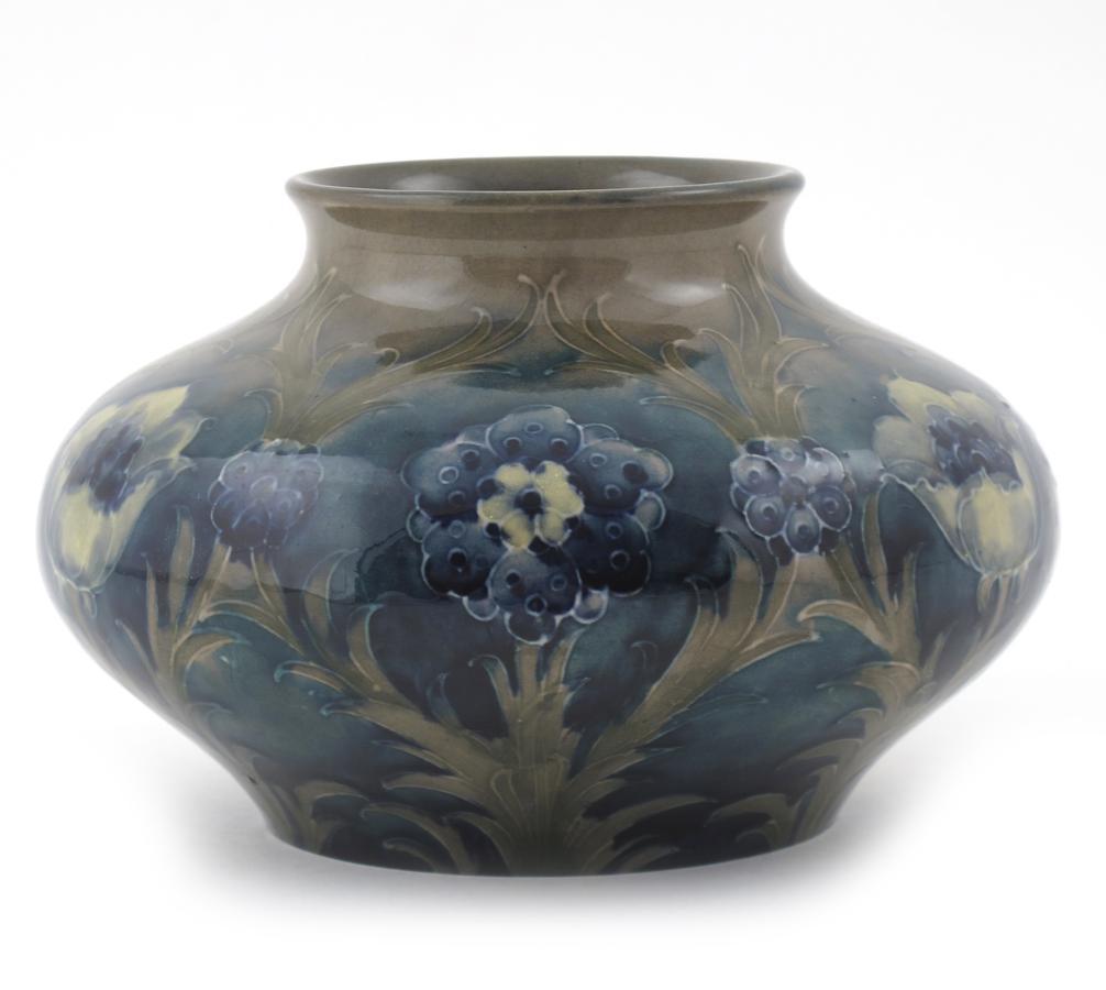 'Late Florian Persian' a Moorcroft Pottery vase, designed by William Moorcroft, dated 1918, compressed ovoid form with everted rim, painted in shades of blue, yellow and green on a green ground impressed marks, painted green signature and 1918 12cm. high