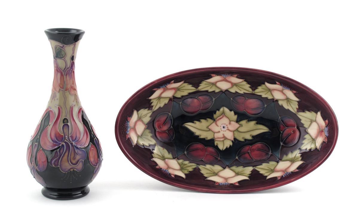 'Fuchsia' a Moorcroft Collector's Club solifleur vase, designed by Rachel Bishop, painted in colours, and a 'Morello' pattern bowl impressed and painted marks, vase 17cm. high