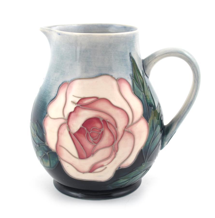 'Rose' a Moorcroft Collector's Club jug, designed by Sally Tuffin, painted in pink and green on a blue ground impressed and painted marks to base 14.5cm. high