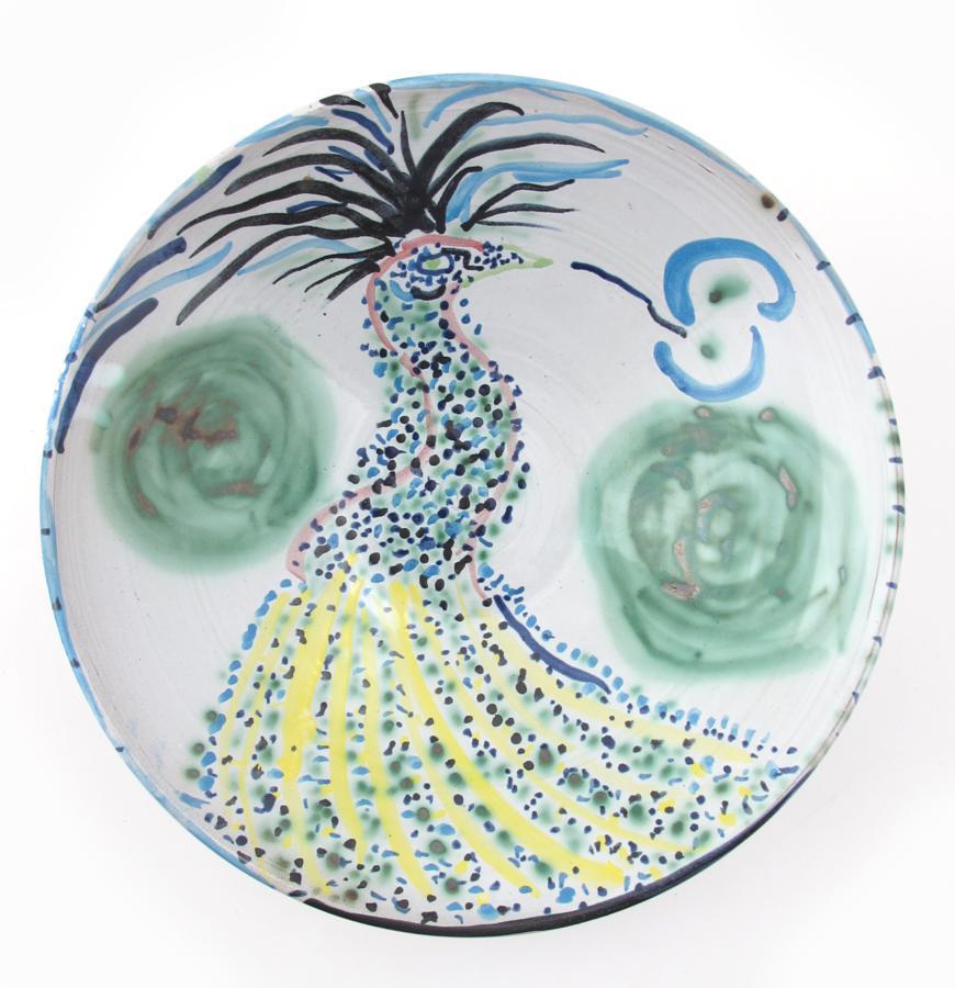 Philip Sutton (born 1928) a Fulham Pottery bowl, painted to the well with a peacock, in colours painted marks to base dated 1987 31cm. diam.