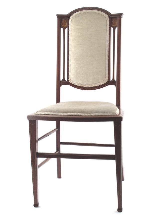 An Art Nouveau mahogany hall chair, inlaid with slender stylised flower stems to the back splat unsigned 93cm. high
