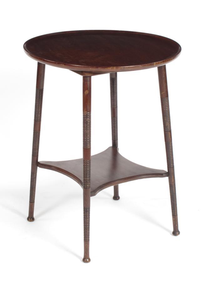 A Liberty & Co mahogany occasional table, circular tray top with turned legs, supporting shaped shelf stamped Liberty & Co 69cm. high