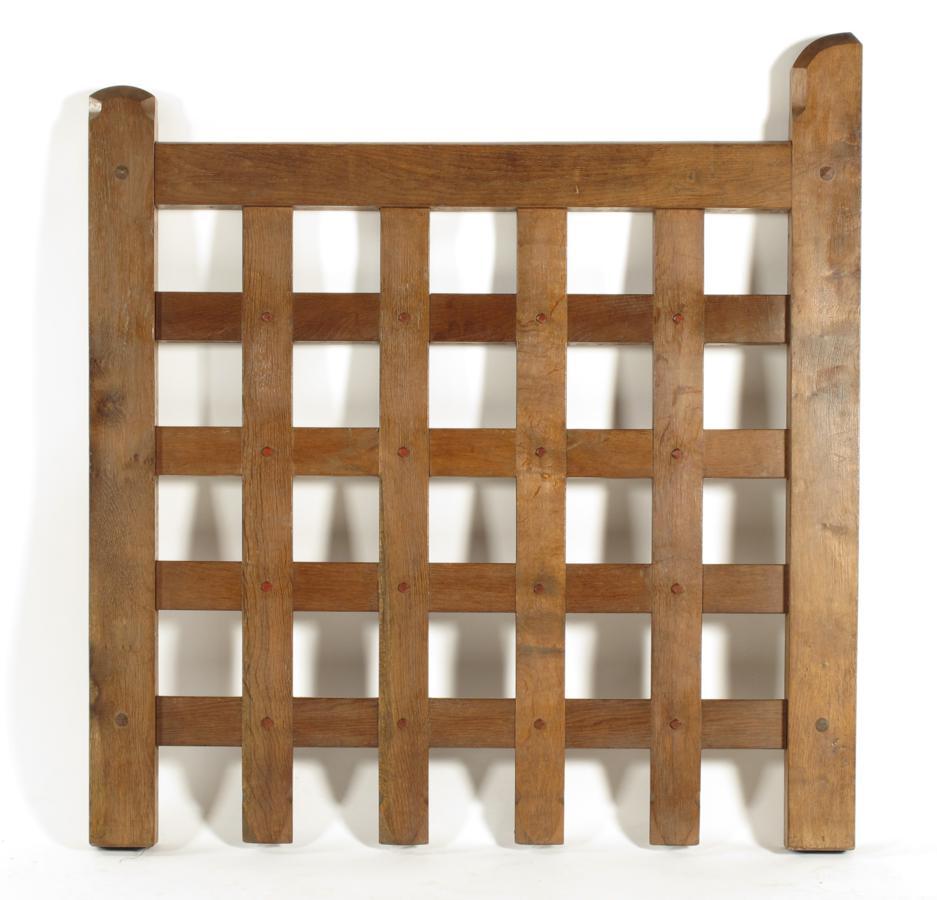 A Cotswold School oak gate, port cullis form, with red enamelled iron pegs unsigned 106cm wide 114cm high