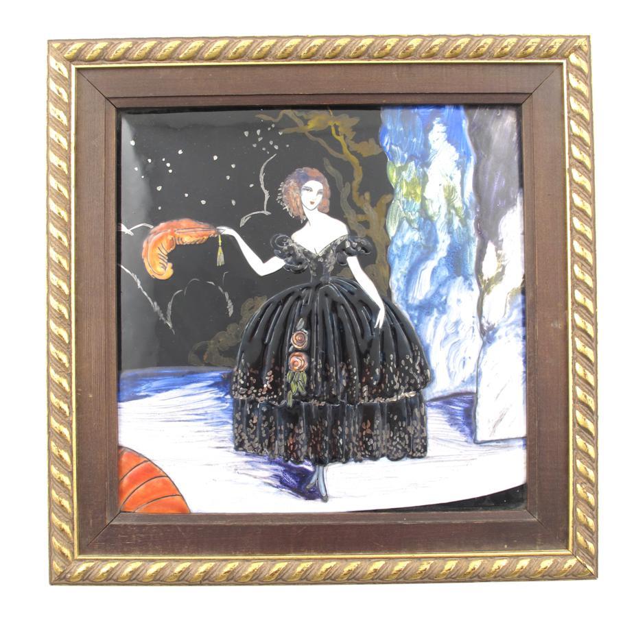 A large Art Deco Limoges enamel plaque, square, painted with a woman in ball gown, holding an orange ostrich feather, in a garden setting, framed painted marks to top corner 24 x 24cm.